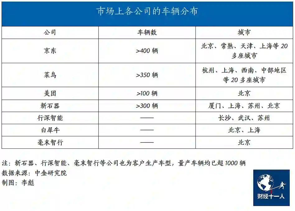 根据公开信息,现阶段已经投入使用的无人配送车中,互联网公司以阿里巴巴、京东的保有量最多,新石器、行深智能等主要生产商也有一席之地。