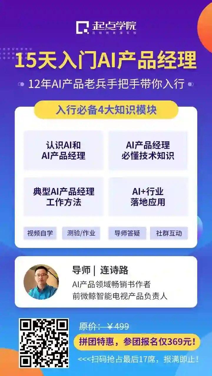 为了帮助这些产品经理少走弯路,更快入行——起点学院联合12年智能产品实战经验的@连诗路老师,发起《15天入门AI产品经理》学习计划,行业、技术、方法、应用,4大模块基础知识一次搞定。AI时代先人一步抢占红利,更有机会竞争高薪!