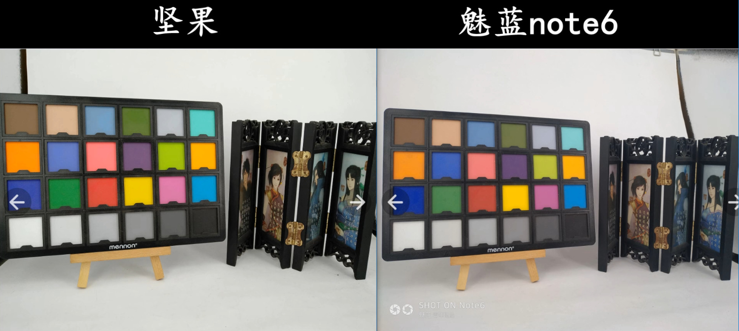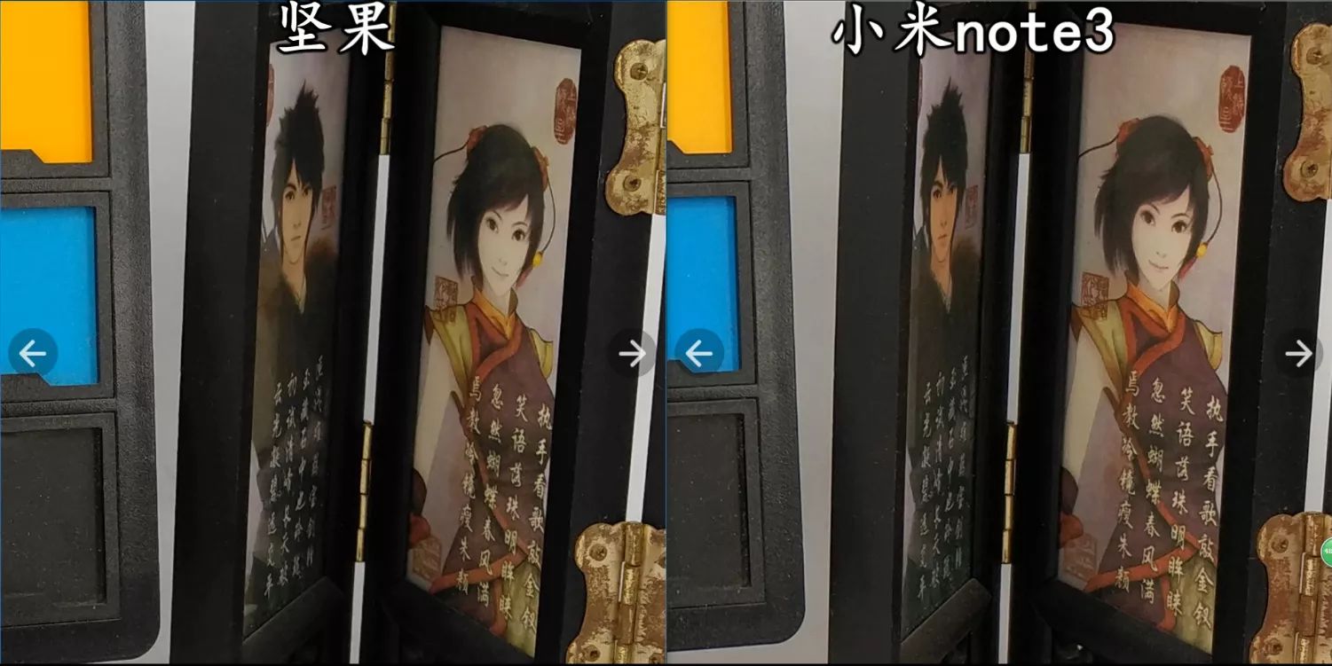 解析力方面,先对比便宜一点的魅蓝 Note 6 坚果的颜色艳丽的多,蓝色已经变成了绿色。人脸的轮廓也被锐化的不太自然。但是文字锐化的更加清晰。再换上6+64版本价格一样的小米 Note 3。小米的脸色红润,而坚果有些蜡黄。解析力也是小米更加自然。