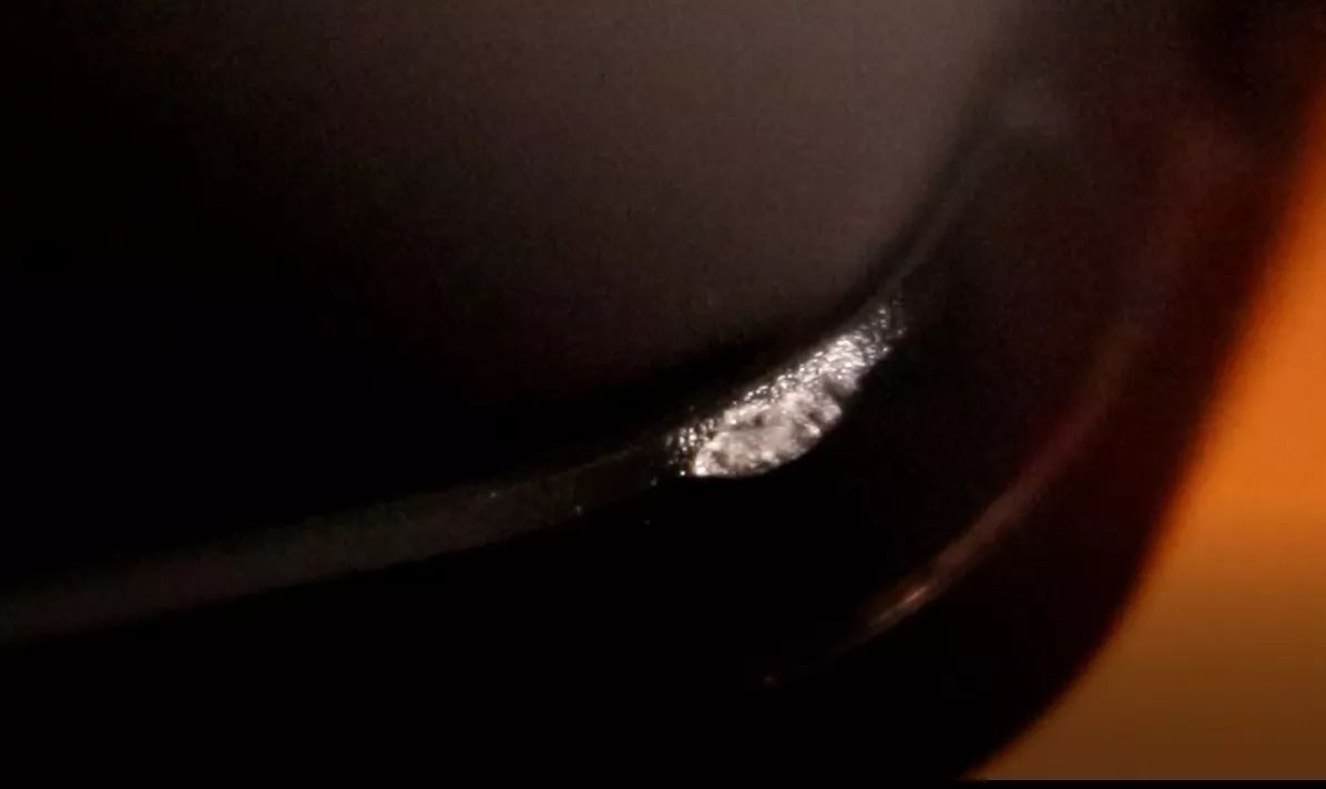 边框本身是金属喷砂工艺,抗汗和指纹的能力都很强。但是衔接的过度是 CNC 切割的折线,这个折线还是很生硬的。你们听刮纸的声音。当然比一代好多了,只有这个细折线是这样。前后玻璃跟金属机身的衔接上也看不到保护圈,可能是用胶密封的。一定要注意防摔。磕碰之后,很容易就变成这样了。直角变形会导致着色层破损,漏出铝合金的原色。
