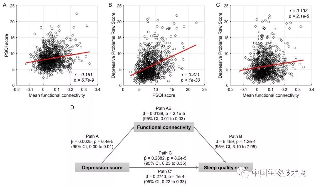 ▲图A、B、C展示了抑郁问题,睡眠问题以及脑功能连接三者之间的相关性,图D展示了脑功能连接调制抑郁问题与睡眠问题的关系