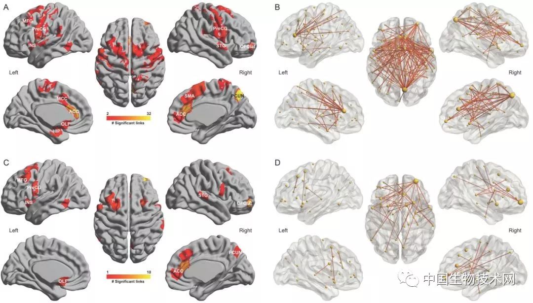▲睡眠以及抑郁问题相关联脑区(AC)以及脑功能连接(BD)在脑中的分布情况