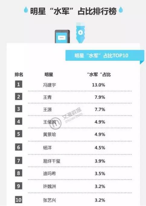冒死发布这张“脱水榜单”的艾漫数据市场中心总经理王蓓对媒体透露,从全网社交平台的数据来看,6% 的水军刷了 90% 的量,集中在 TF-boys 和一些选秀出身的艺人上。大家关注度比较高的 EXO 归国四子也有,陈学冬也挺多的。