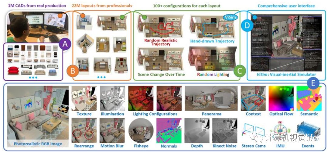 目前发现的唯一一个同时包含RGB-D-IMU的(虚拟)数据集。有非常多的场景,做的也非常专业,提供了语义标签,fisheye,模拟了快速相机运动以及图像模糊。遗憾的是数据集还没有开放下载。