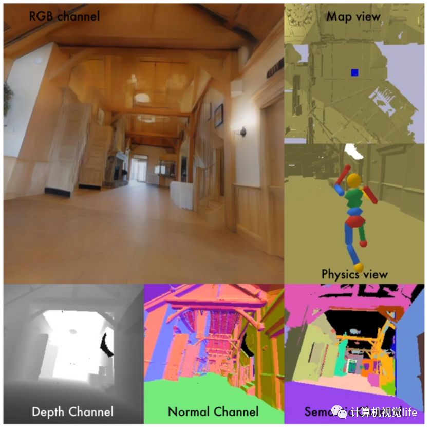 提供大量真实场景的三维模型,包含纹理、几何以及语义,以此来模拟训练移动机器人的感知能力(AI系统)