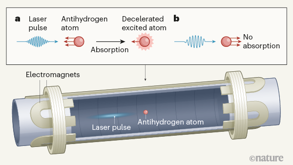 研究人员研发了一种激光器,该激光器经过仔细调谐,发出波长仅使反氢原子向内移动的光子,被捕获的反氢原子通过吸收光子得以减速。由于多普勒效应,激光束的光向较短的波长偏移,偏移后的波长正好与原子需要吸收的光子能量匹配,使原子从基态提升到激发态。然后,原子再通过沿随机方向发射另一个光子而自发地返回基态,离开激光器。