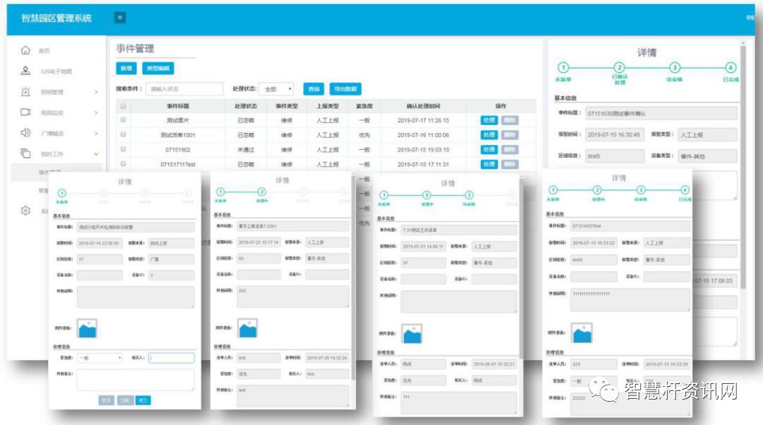平台提供统一的园区事件处理窗口。缩短决策时间,提高处置效率。其次对事件的接收、分派、执行、反馈等各阶段情况进行记录,建立起事件档案。
