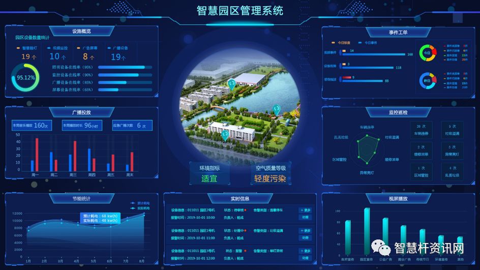 平台基于智慧杆搭载的智能终端硬件,实现对园区、景区等区域的综合管控,通过智能化手段实现资产之间的信息互通和共享,将分散的各应用系统,统一到可视化平台,通过多系统的联动交互,以及事部件的闭环处置,实现智慧管理。