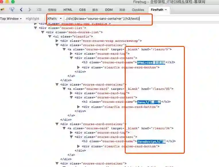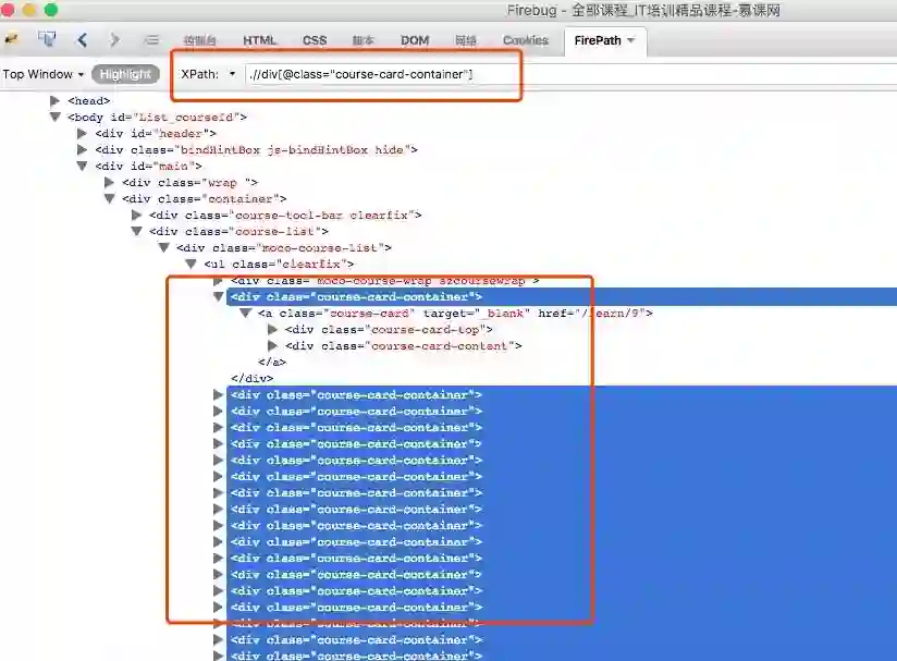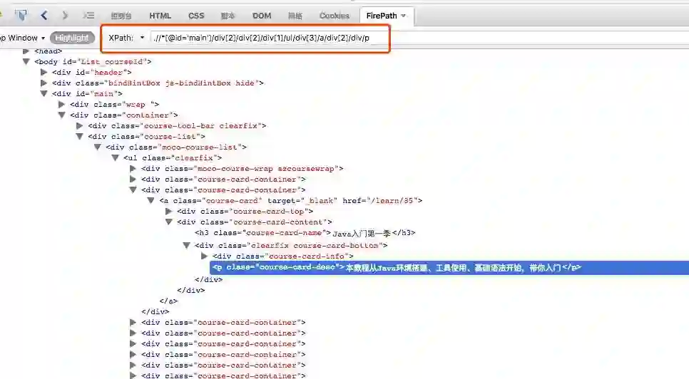 双斜杠 // 表示获取所有的指定元素,比如上面第一句就是在esponse内容里取所有的指定class属性值为"course-card-container"的div标签