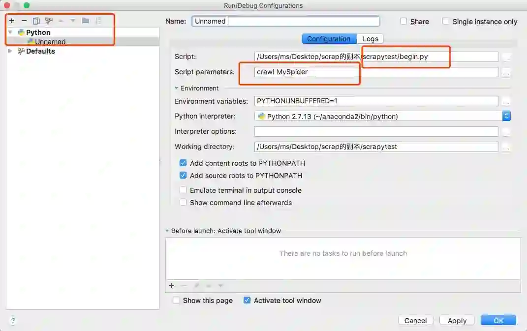 Script parameters 框 填入crawl MySpider ,其实就是crawl +爬虫名字,其他配置选项默认,点ok,就可以运行爬虫了。