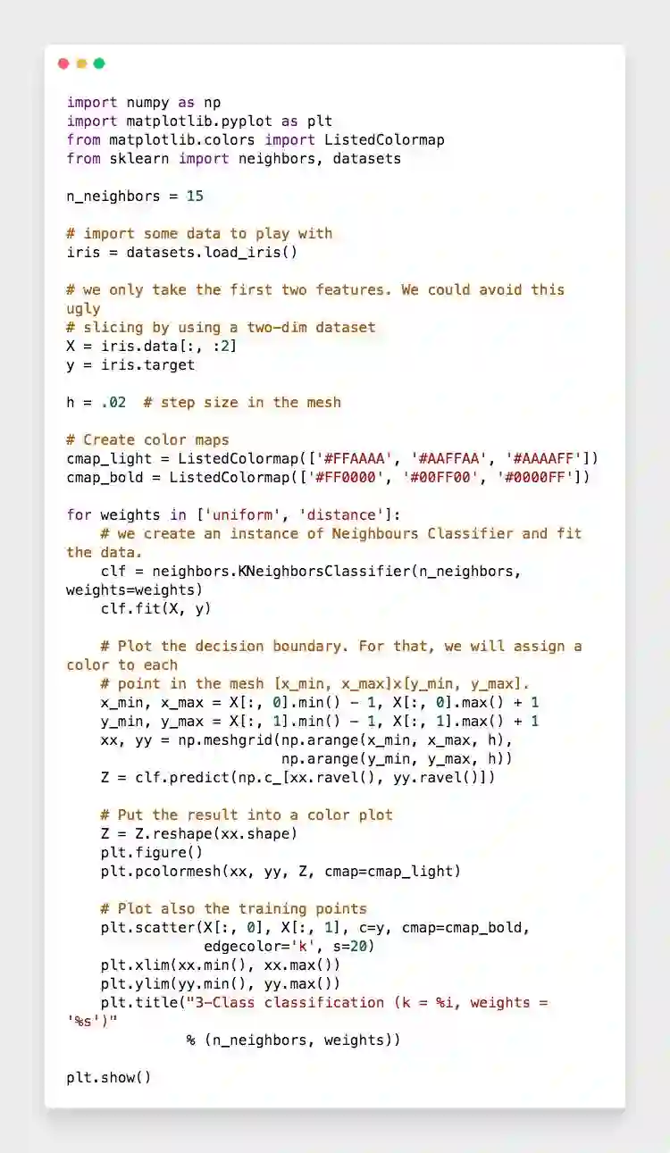 接下来,我们使用 scikit-learn 库中的 KNN 对 iris 数据集分类效果进行预测实战。众所周知,iris 数据集有四个维度的特征,但是为了方便展示效果,我们只使用其中的两个维度。完整的代码实现如下: