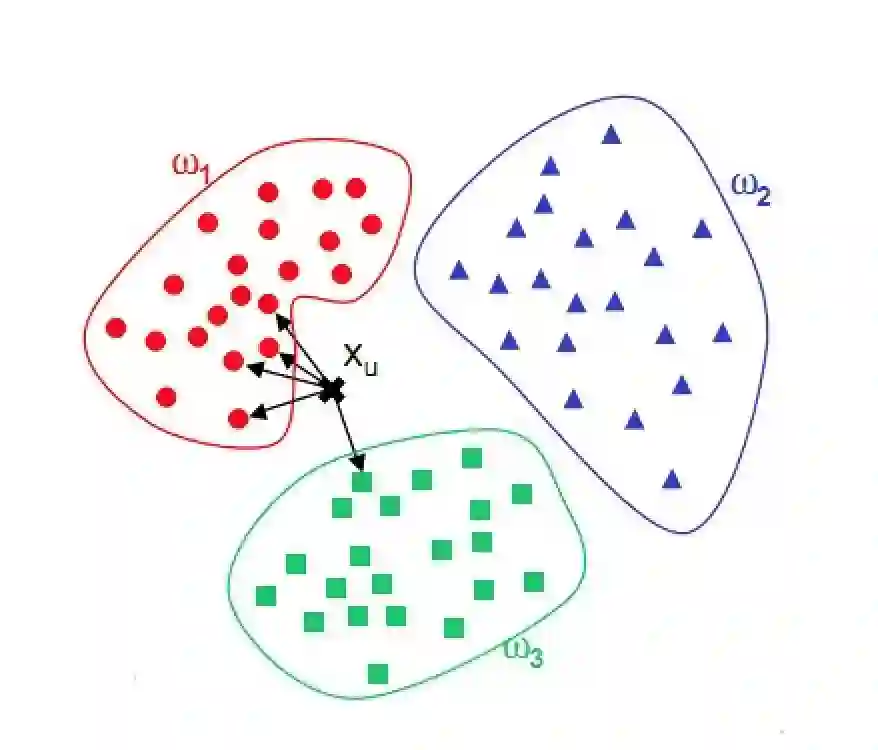 如上图所示,w1、w2、w3 分别代表的是训练集中的三个类别。图中与 xu 最相近的5(k=5)个点如图中箭头所指,很明显与 xu 最相近的5个点中最多的类标为 w1,因此 KNN 算法将 xu 的类别预测为 w1。