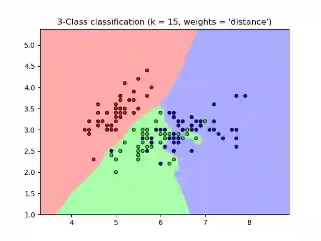 代码中邻居数ke的是 n_neighbors = 15,只使用 iris 的前两维特征作为分类特征。权重度量采用了两种方式:均值(uniform)和距离(distance)。均值代表的是所有的 K 个近邻在分类时重要性选取的是一样的,该参数是默认参数;距离也就是说,分类时 K 个邻居中每个邻居所占的权重与它与预测实例的距离成反比。