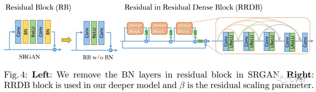 A.Network Architecture:: 1) remove all BN layers; 2) replace the original basic block with the proposed Residual-in-Residual Dense Block (RRDB)