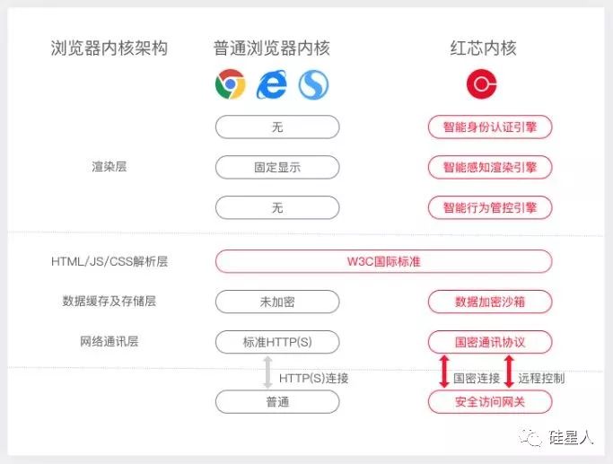 通过这张图我们可以清晰地看到,国外的产品简直弱爆了:这些浏览器甭管有多少开发者维护,技术有多先进,用户量有多大,该有的还是没有;而咱们的红芯呢?拥有智能的认证引擎、渲染引擎、管控引擎,而且还有强大的“国密通讯协议”,支持统一管控、远程控制,简直不能再强大好吗?