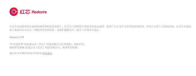 About 页面显示,红芯浏览器是“在通用的浏览器构架的基础上,结合自主创新的专利技术改造而成的”。而区别于其他浏览器,红芯主要面向企业办公、物联网之类的商用场景。
