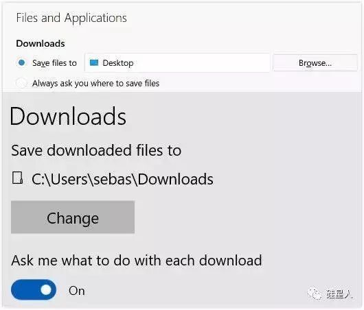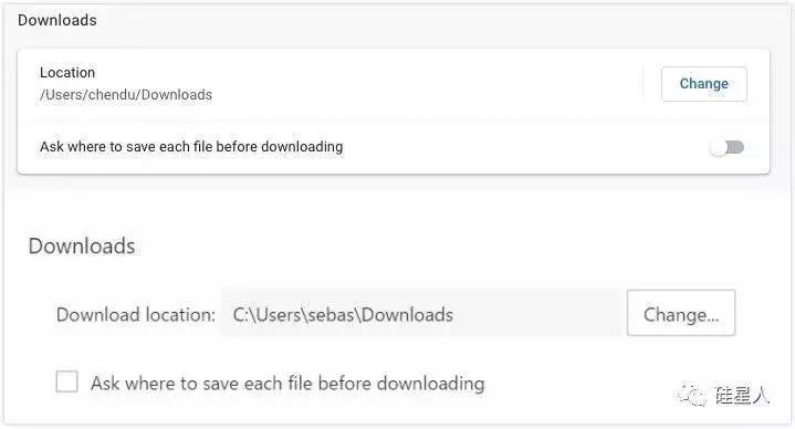 不对,等等:我发现,除了部分设置的顺序安排不一致,红芯的设置选项的文案跟 Chrome 基本都是相同的。比如下载文件的路径和是否每次询问路径,截图上面是红芯,下面是 Chrome: