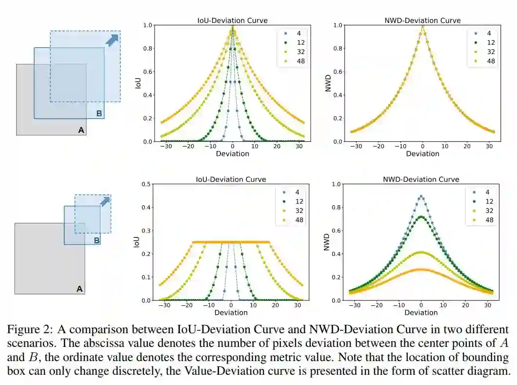 具体来说,对于 像素的小目标,轻微的位置偏差会导致明显的loU下降(从0.53下降到 ),导致 标签分配不准确。然而,对于 像素的正常目标,loU略有变化(从0.90到 ),位置偏差相同。此外,图2给出了4条不同目标尺度的loU-Deviation曲线,随着目标尺度的减小,曲线下降速度更快。值得注意的是,loU的敏感性来自于BBox位置只能离散变化的特殊性。