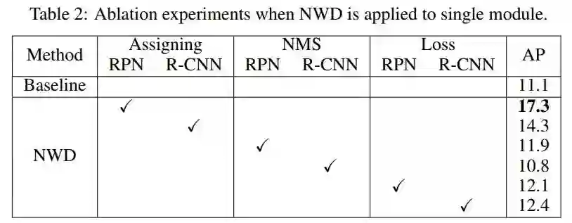 还可以看到,本文提出的方法在6个模块中的5个模块中提高了性能,这显著验证了基于NWD的方法的有效性。而R-CNN的NMS性能下降可能是由于默认的NMS阈值是次优的,需要进行微调来提高性能。