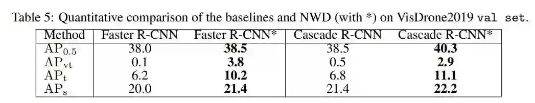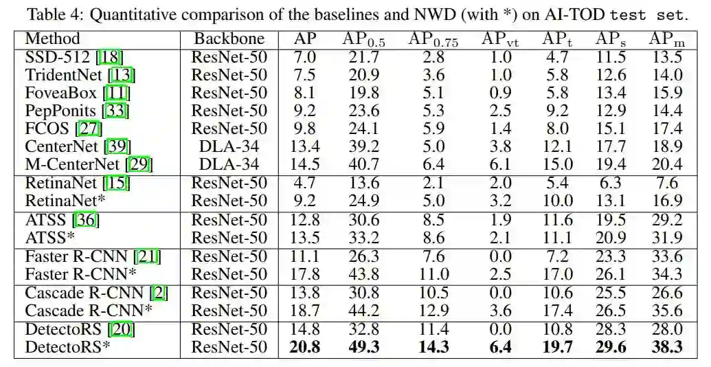 NWD可应用于One-Stage和Multi-Stage Anchor-Based检测器。此外,NWD不仅可以替代标签分配中的IoU,还可以替代非最大抑制中的IoU(NMS)和回归损失函数。在一个新的TOD数据集AI-TOD上的大量实验表明,本文提出的NWD可以持续地提高所有检测器的检测性能。
