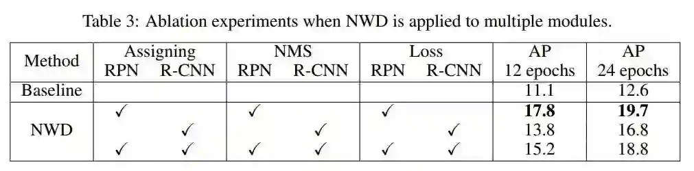实验结果如表3所示。当训练12个Epoch时,在RPN、R-CNN或所有模块中使用NWD时,检测性能均有显著提高。当将NWD应用于RPN的3个模块时,获得了最佳的17.8%的性能。然而,在所有6个模块中使用NWD时,AP比RPN中仅使用NWD下降了2.6%。为了分析性能下降的原因,增加了一组实验,对网络进行了24个Epoch的训练。可以看出,性能差距从2.6%减小到0.9%,说明在R-CNN中使用NWD时,网络收敛需要更多的时间。因此,在接下来的实验中,只在RPN中使用NWD,以更少的时间获得相当大的性能提升。
