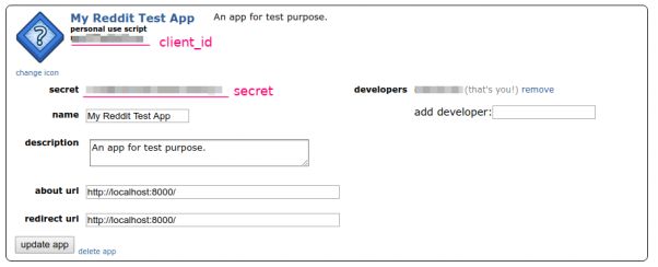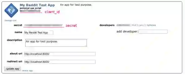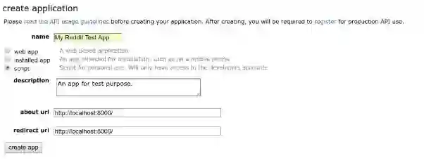 第一步:在Reddit上创建一个应用。登录之后前往“preferences → apps”页面,底部有个名为“create another app...”的按钮。点击后创建一个“script”类型的应用。我们不需要提供“about url”或“redirect url”,因为这个应用不对公众开放,也不会被别人使用。