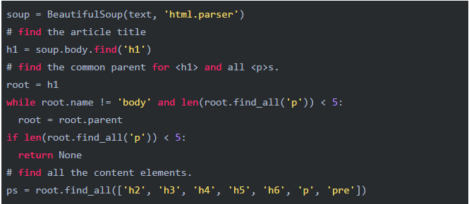 下一步是从HTML中提取内容。我们的目标是提取新闻的标题和正文,而且可以忽略其他不需要阅读的内容,如页首、页脚、侧边栏等。
