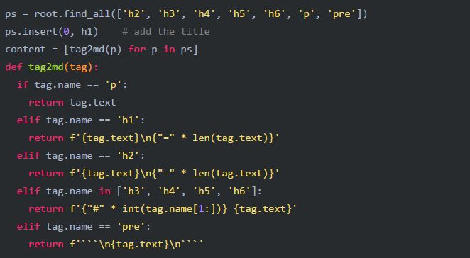 本例中我只提取了<h#>和<p>、<pre>,所以简单的函数就能满足要求: