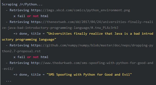 先做一下测试,从/r/Python获取最流行的5条新闻: