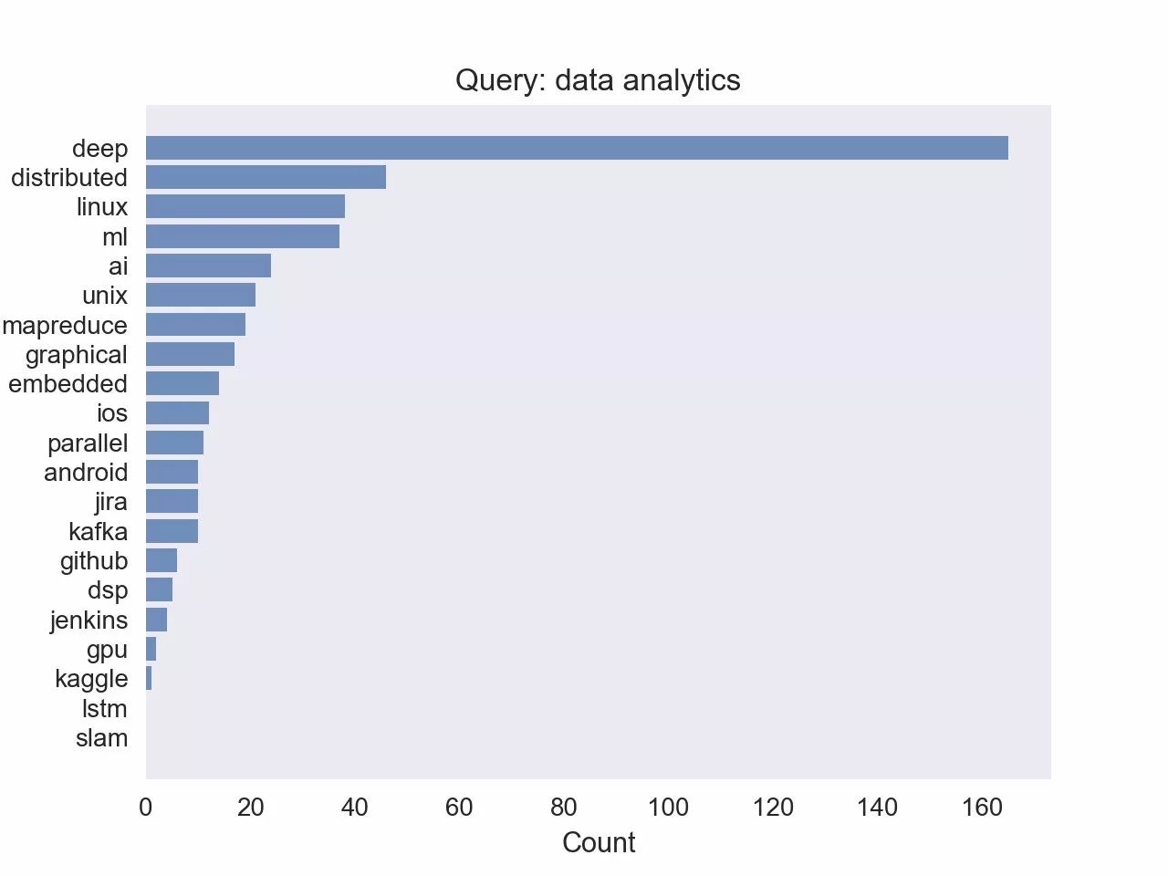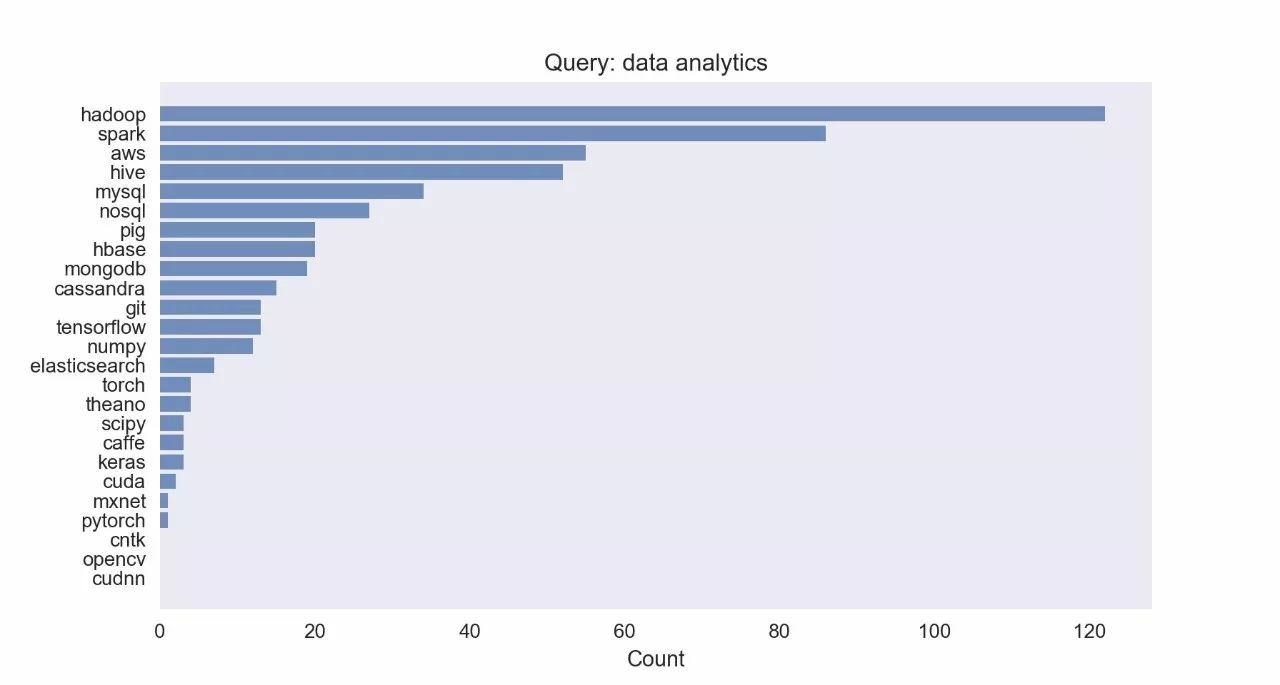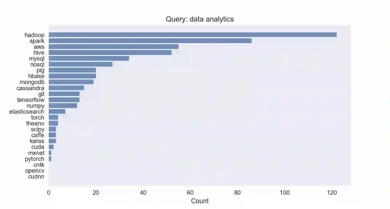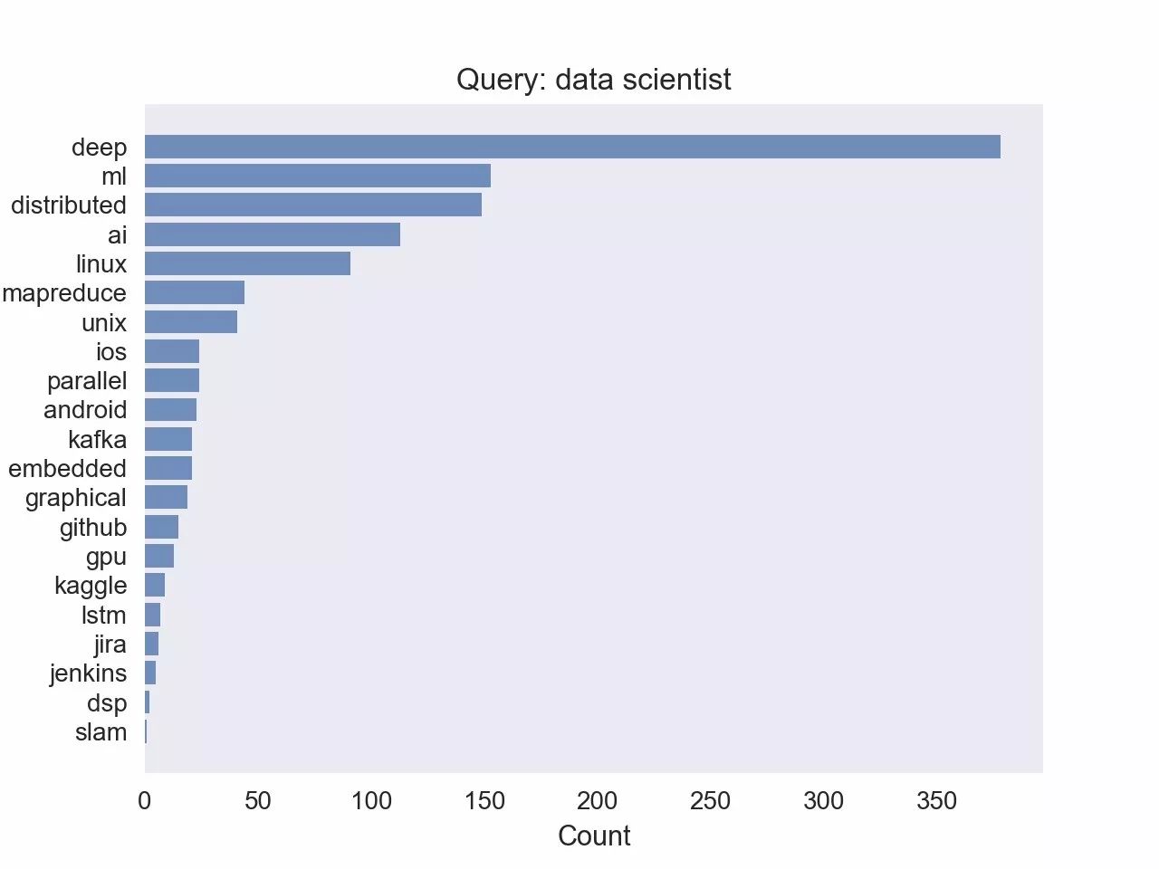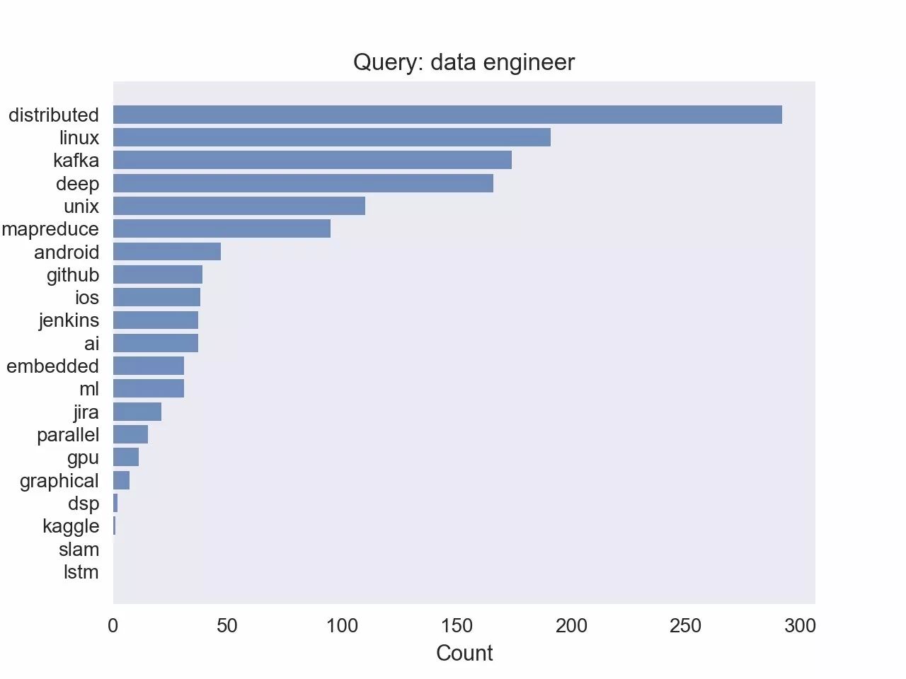 该类别基本上指我不能确切放入相关类别的所有词语。所以我简单地把它们集中在杂类中,但出现了一些有趣的结果。Kafka 出现在数据工程师职位的第三位,但在任何其他查询中都不在领先位置。“Al”在数据分析学和数据工程师招聘职位中不是很显眼。MapReduce 在数据工程师职位中的出现的次数比在任何其他职位中多一倍(我认为有道理)。令人吃惊的是,Kaggle 几乎没有出现在任何查询的任何招聘职位中。我不知道这是否因为公司不知道 Kaggle 是什么,还是参加预测建模比赛不具有很强的吸引力。
