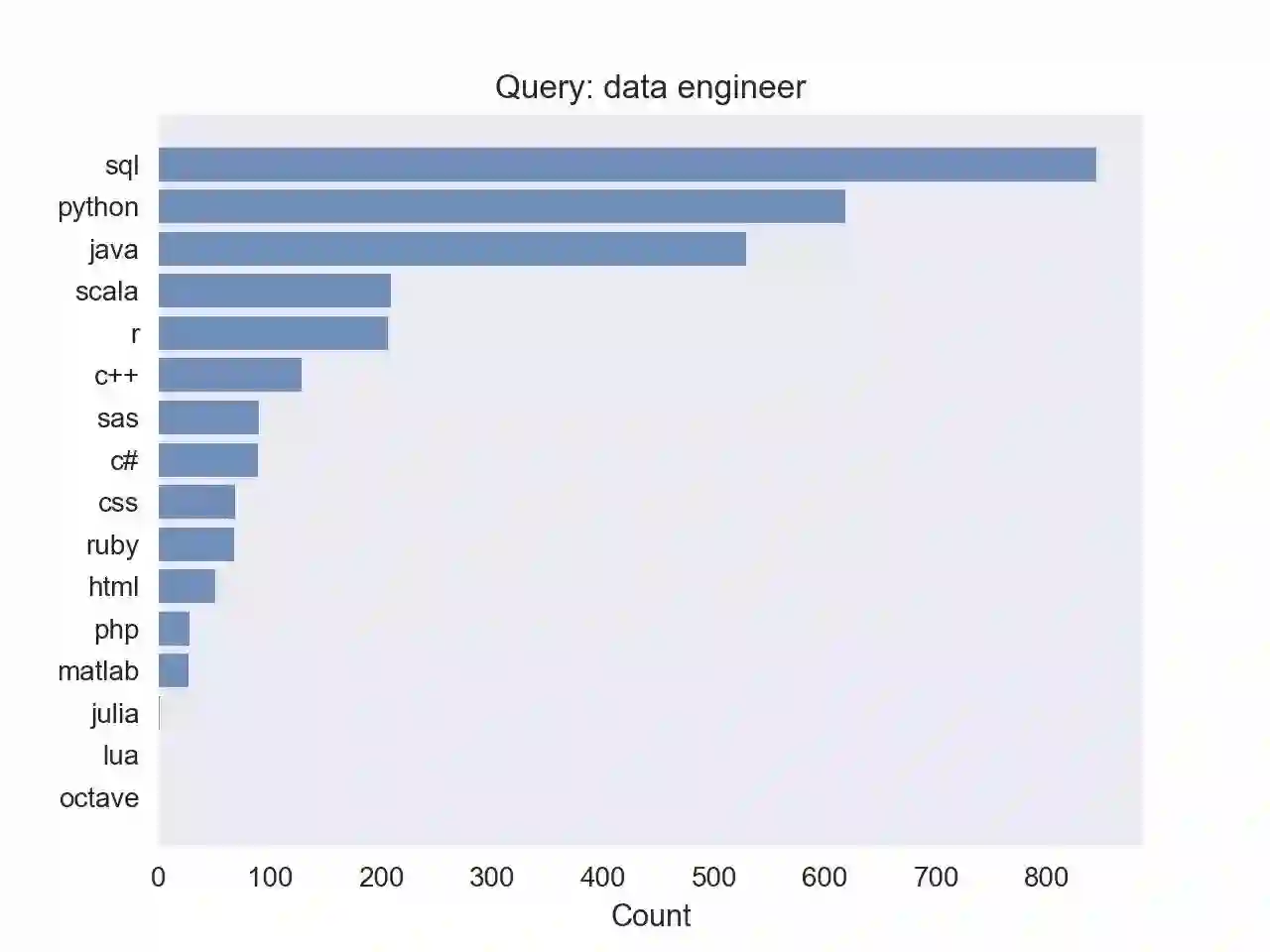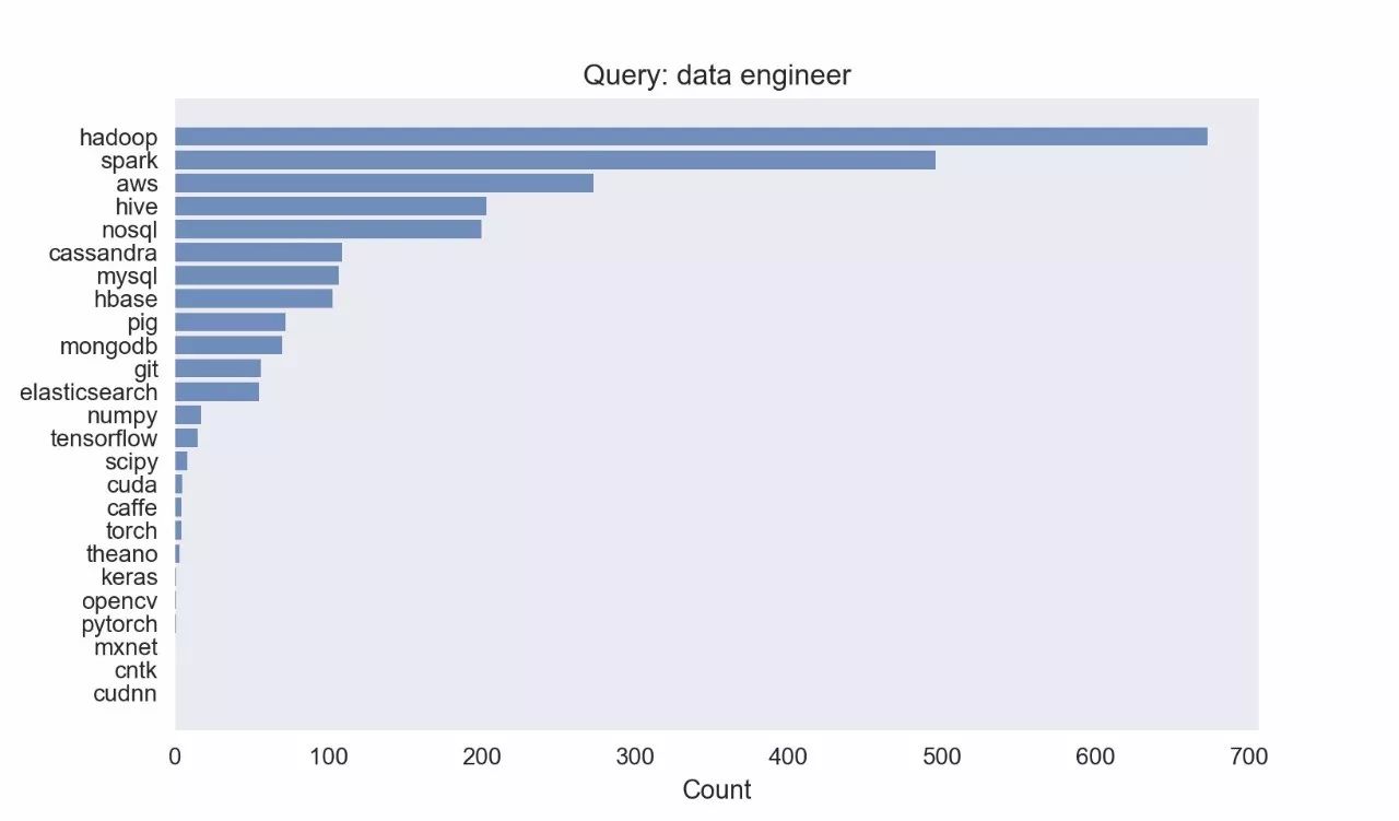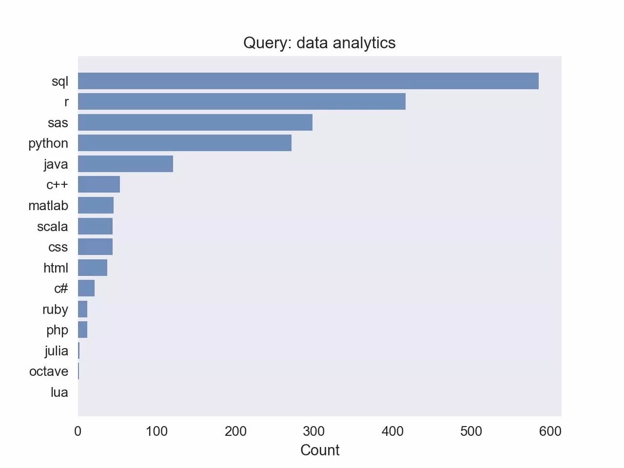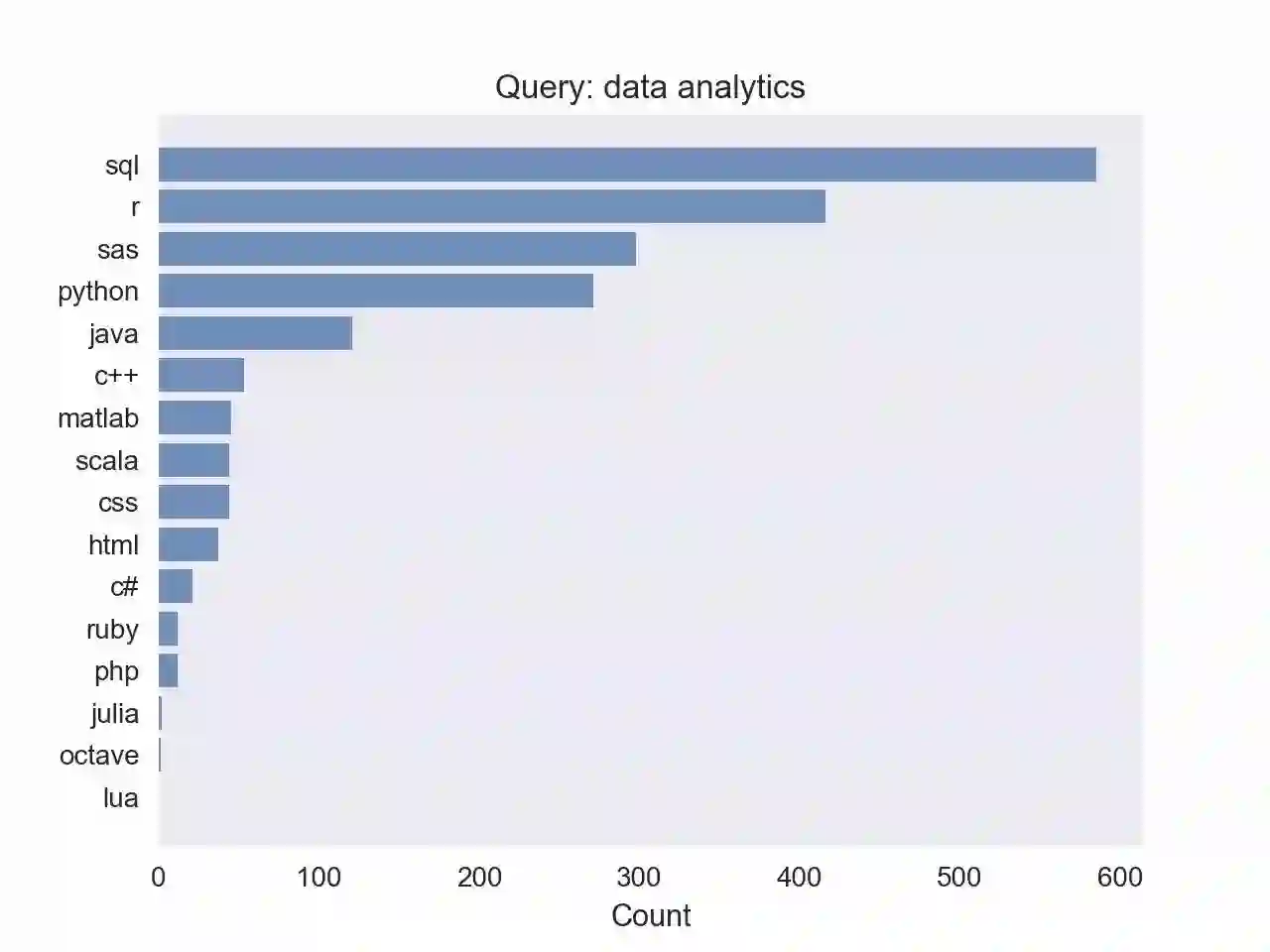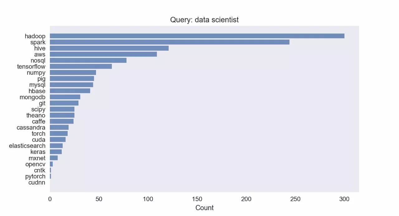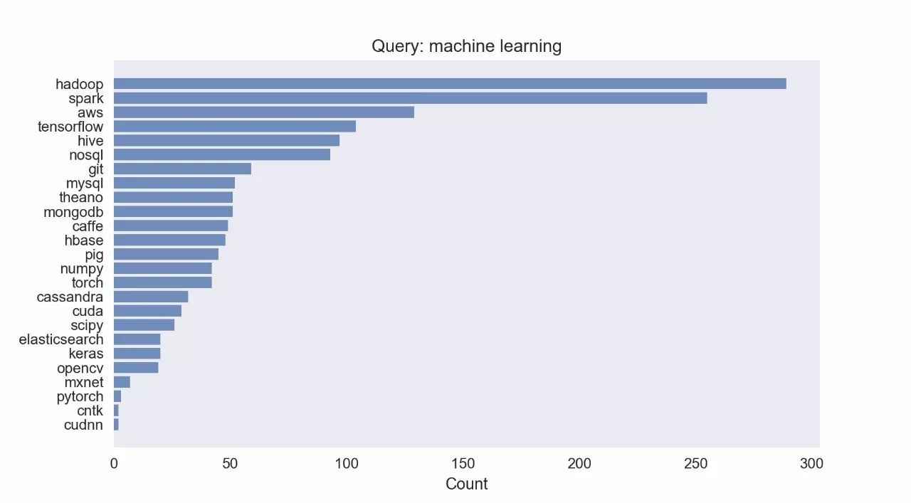 该类别基本上指我不能确切放入相关类别的所有词语。所以我简单地把它们集中在杂类中,但出现了一些有趣的结果。Kafka 出现在数据工程师职位的第三位,但在任何其他查询中都不在领先位置。“Al”在数据分析学和数据工程师招聘职位中不是很显眼。MapReduce 在数据工程师职位中的出现的次数比在任何其他职位中多一倍(我认为有道理)。令人吃惊的是,Kaggle 几乎没有出现在任何查询的任何招聘职位中。我不知道这是否因为公司不知道 Kaggle 是什么,还是参加预测建模比赛不具有很强的吸引力。