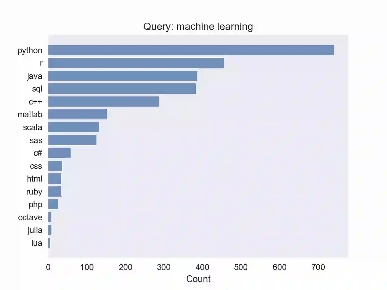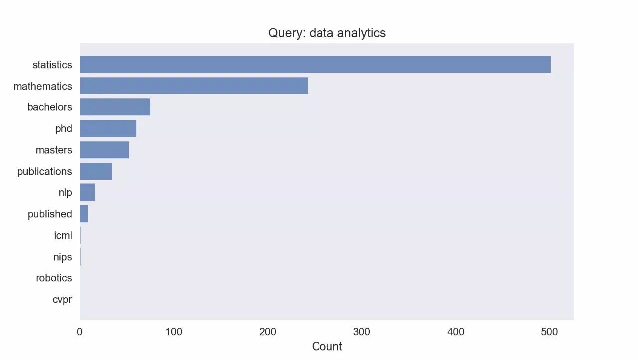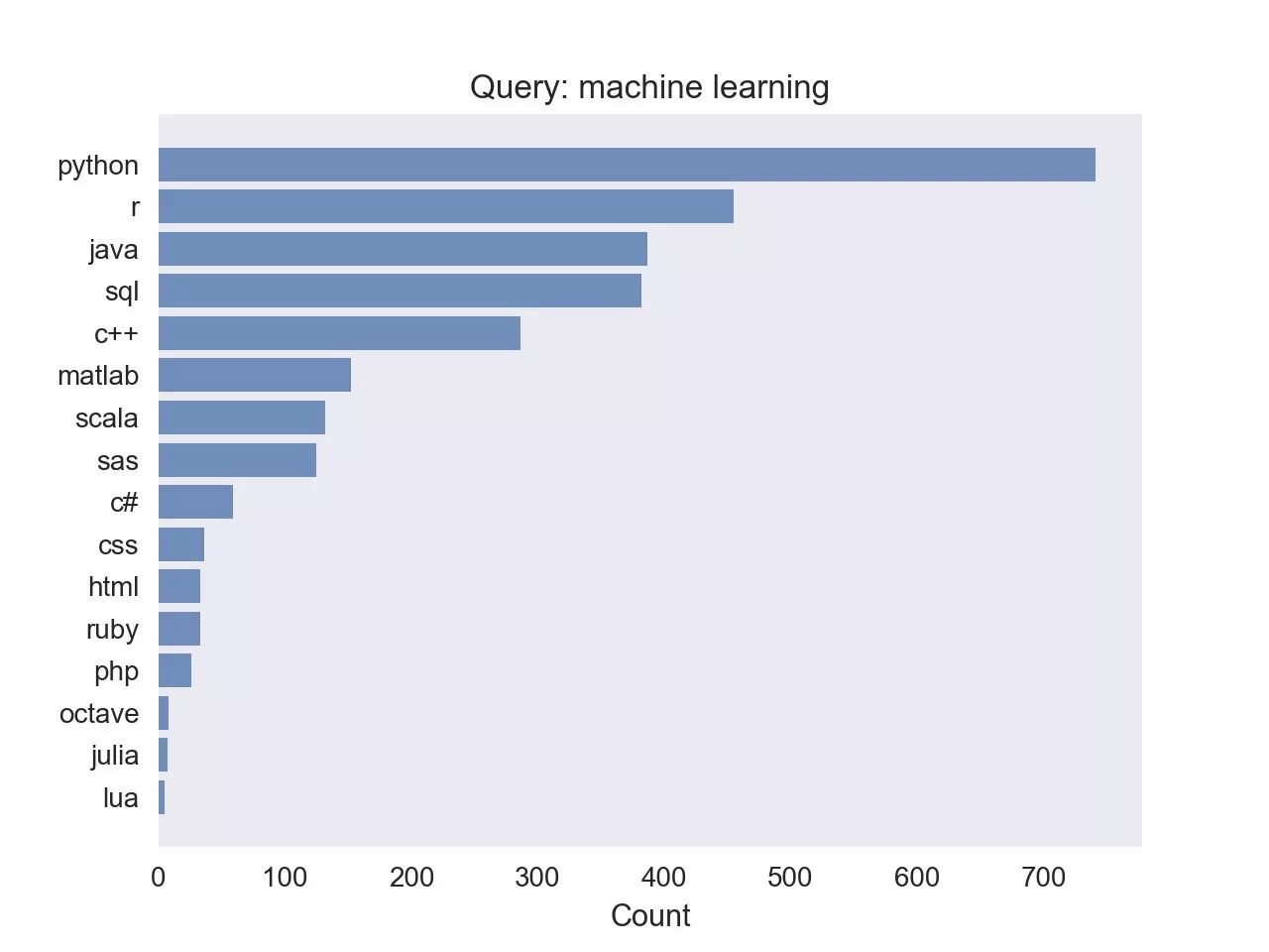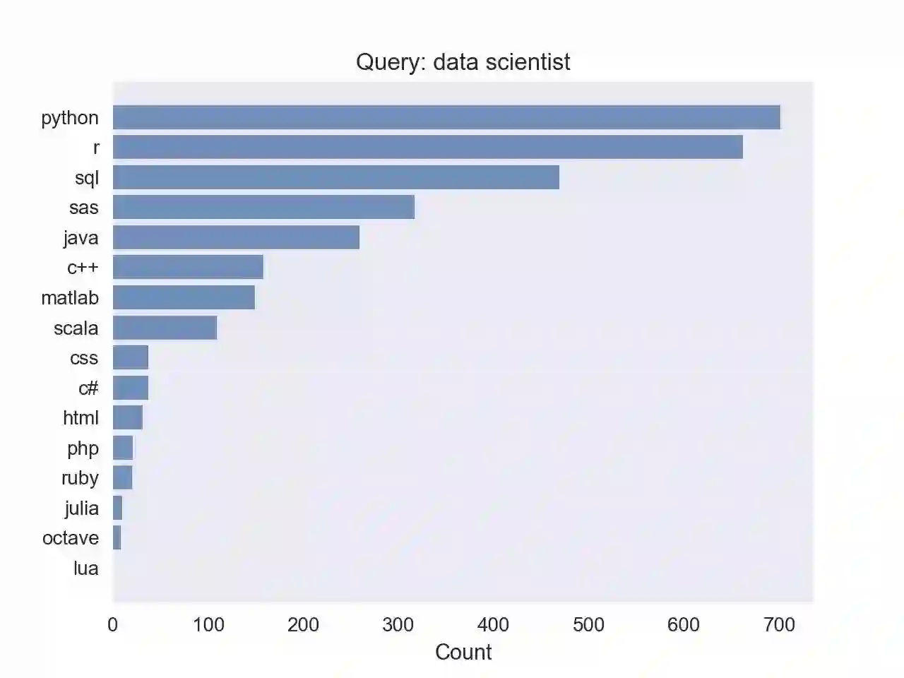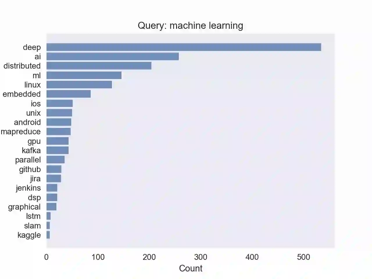 该类别基本上指我不能确切放入相关类别的所有词语。所以我简单地把它们集中在杂类中,但出现了一些有趣的结果。Kafka 出现在数据工程师职位的第三位,但在任何其他查询中都不在领先位置。“Al”在数据分析学和数据工程师招聘职位中不是很显眼。MapReduce 在数据工程师职位中的出现的次数比在任何其他职位中多一倍(我认为有道理)。令人吃惊的是,Kaggle 几乎没有出现在任何查询的任何招聘职位中。我不知道这是否因为公司不知道 Kaggle 是什么,还是参加预测建模比赛不具有很强的吸引力。