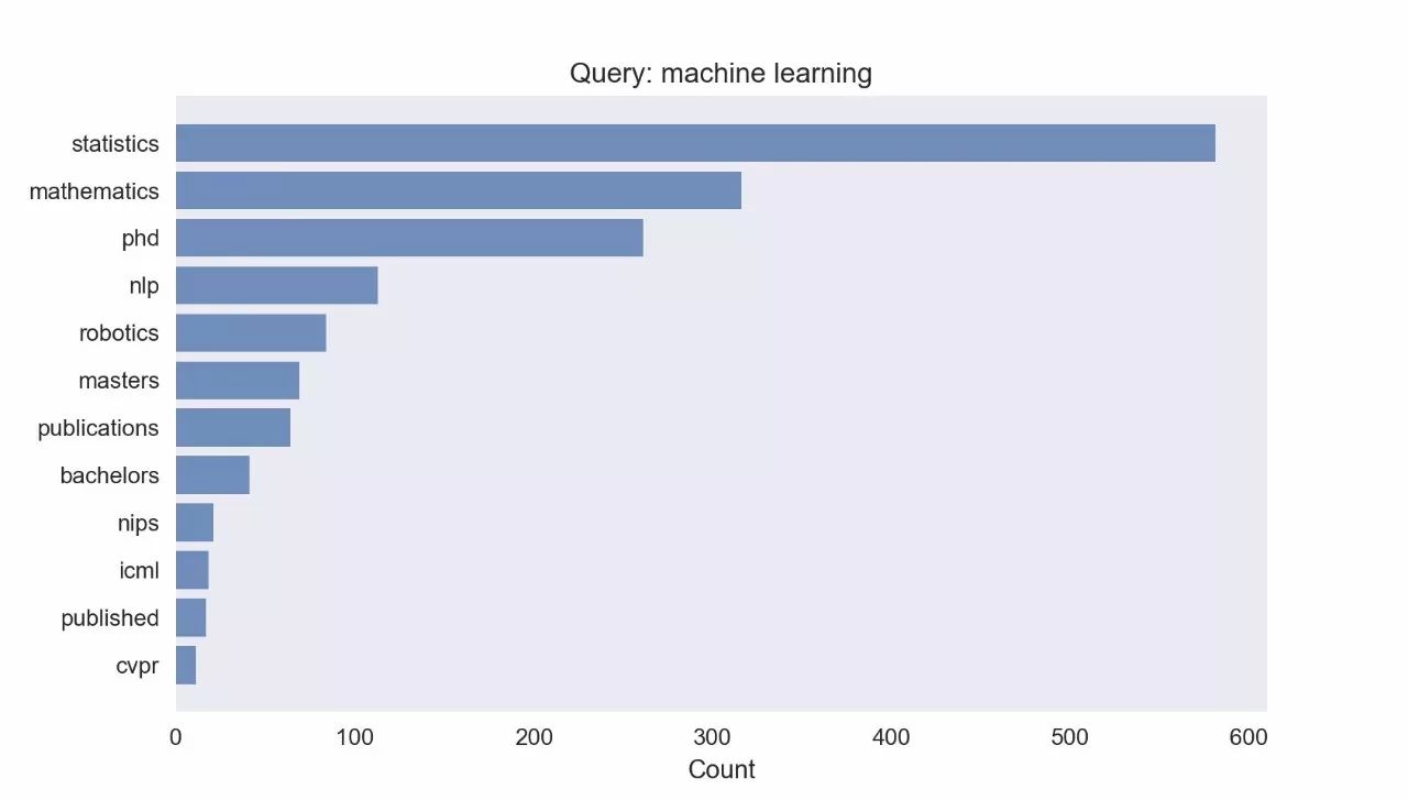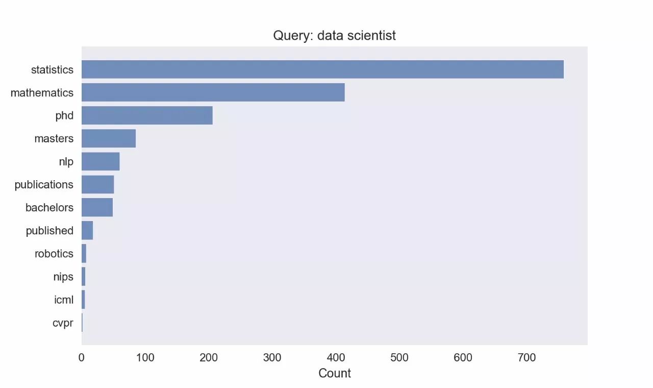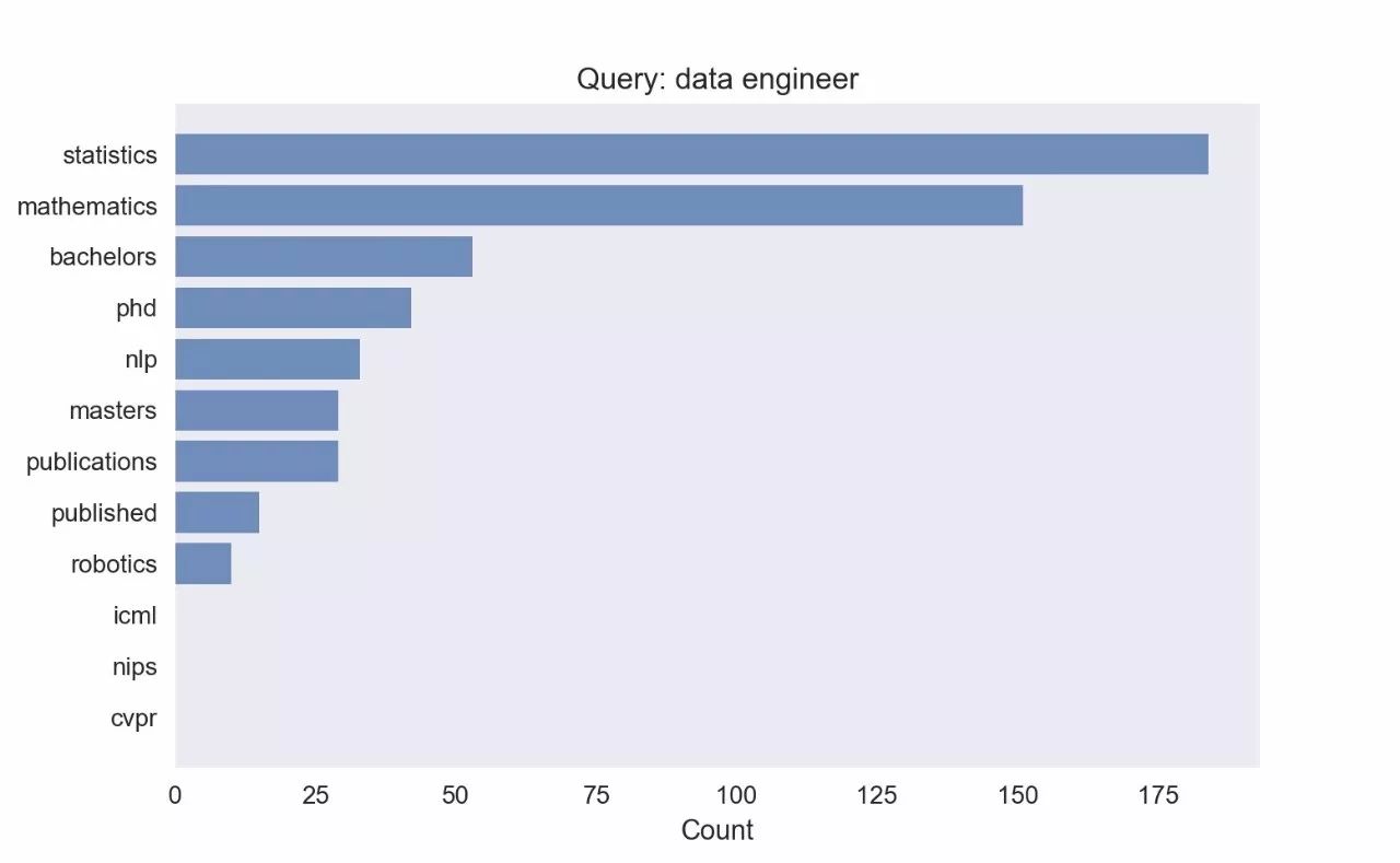 这时,我开始查看如学术等非技术资格。“数据分析学和数据工程师”职位与“机器学习和数据科学家”职位显示的结果类似。“统计学”和“数学”在“机器学习和数据科学家”招聘职位中出现大约 2000 次,在“数据工程师和数据分析学”中仅出现了 1000 多次。显然拥有博士学位在机器学习和科学家职位方面更受欢迎,但现在,在大多数情况下,硕士就足够了。事实上,拥有学士学位,辅以大量的 Al 方面的个人项目经验,同样可以跨入门槛。在“机器学习”的查询结果中看到顶级机器学习期刊(NIPS、ICML 等)也非常有趣。如果你倾向于数学或研究,那么你可能更适合 ML 职位。
