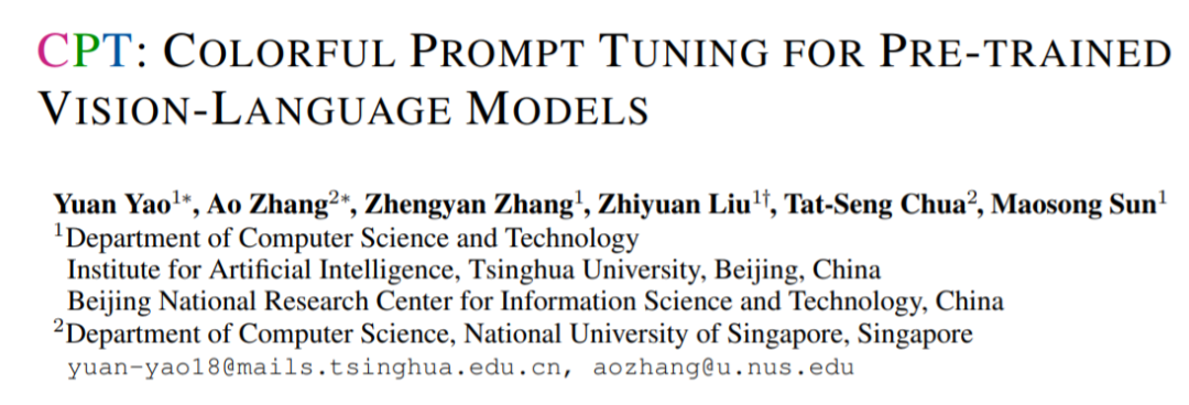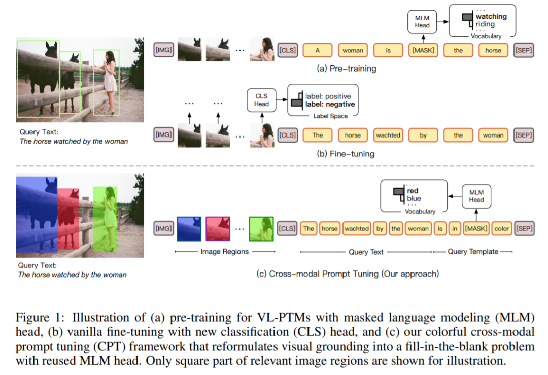 在这篇论文中,受到自然语言处理领域的预训练语言模型进展启发,研究者提出了一种调整 VL-PTM 的新范式——CPT( Cross-modal Prompt Tuning 或 Colorful Prompt Tuning)。其中的核心要点是:通过在图像和文字中添加基于色彩的共指标记(co-referential marker),视觉定位可以被重新表述成一个填空题,从而尽可能缩小预训练和微调之间的差异。