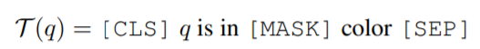 如图 1 所示,为了在图像数据中定位自然语言表达,CPT 由两部分构成:一是用色块对图像区域进行唯一标记的视觉 sub-prompt;二是将查询文本放入基于色彩的查询模板的一个文本 sub-prompt。针对目标图像区域的显式定位可以通过从查询模板中的 masked token 中恢复对应颜色文本来实现。