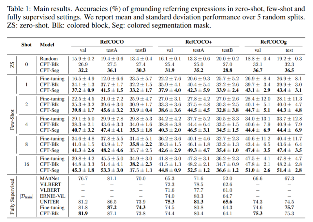 1. 在 zero-shot 和 few-shot 设置中,CPT 的性能大大优于随机基线和强微调基线。例如,使用色块作为视觉 sub-prompt,在 RefCOCO one shot 中,CPT 绝对准确率提高了 17.3%,相对标准差平均降低了 73.8%。这表明 CPT 可以有效地提高 VL-PTM 微调的数据效率,并激发 VL-PTM 的视觉定位潜力。
