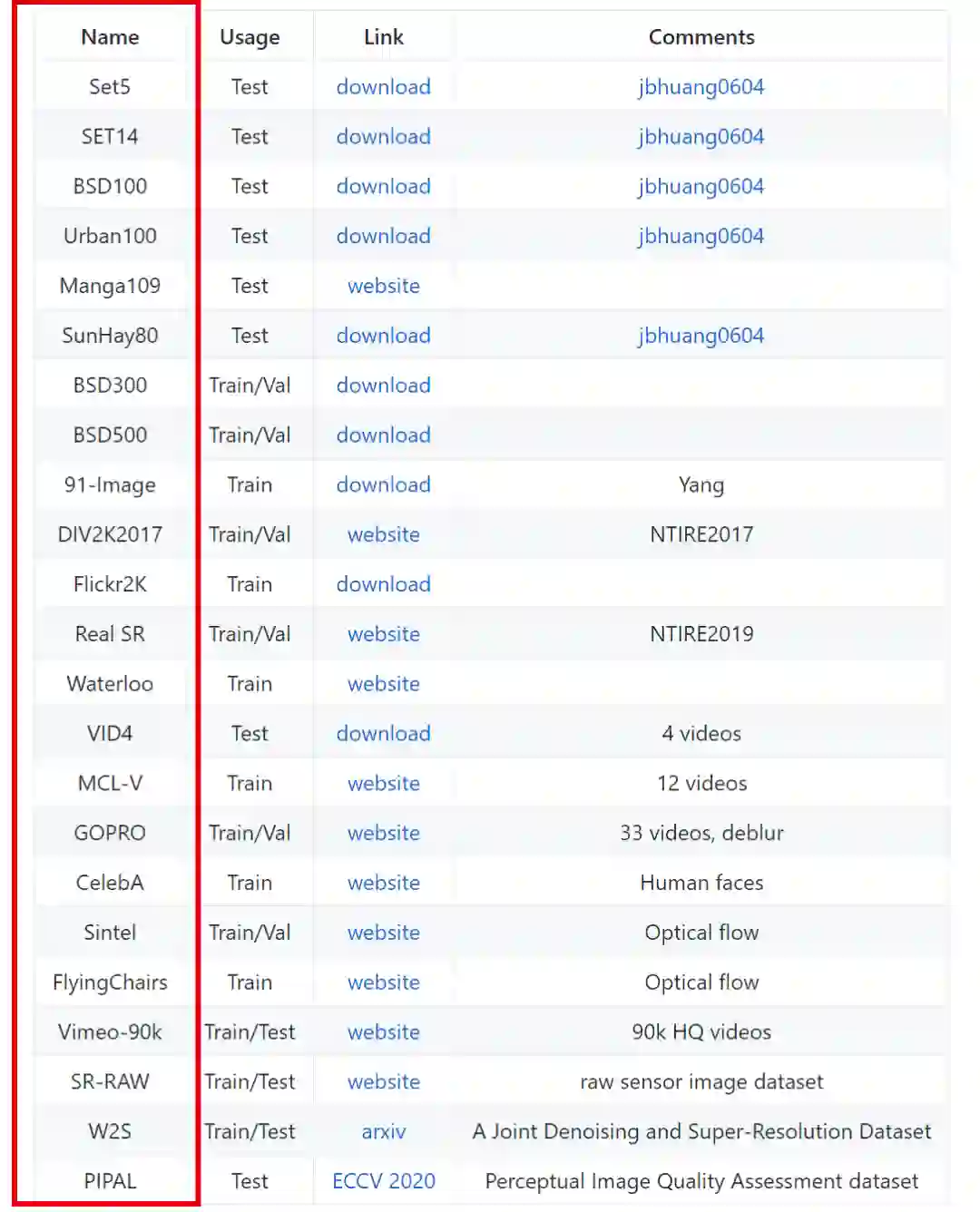 系统性整理了非常多的数据集,并都提供了下载链接,整理的很用心。比如Set14、BSD100和Urban100等。