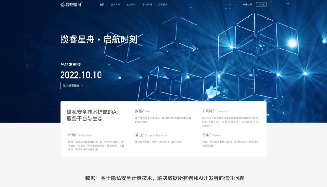 为了更好地解决 AI 发展的一些困境,翼方健数近日正式宣布上线隐私安全计算护航的 AI 服务平台——揽睿星舟。平台运用隐私安全计算技术,在保护数据和算法安全的前提下,汇聚行业及公共数据集,集约算力部署,集成包括软硬件在内的最新 AI 技术,提供全流程一站式服务。揽睿星舟用数据、算力、资金、技术和运营能力加速 AI 发展,赋能长尾的 AI 应用场景,充分实现人工智能供需之间的高质量对接。揽睿星舟这个项目源自于翼方健数在隐私安全计算在市场上与 AI 行业的痛点碰撞,结合了来自 AI 与数据协作过程中的安全保护案例、AI 供应商技术遴选案例、AI 招投标及比赛案例,能够满足基于需求与技术融合推动的一系列 AI 场景需求。