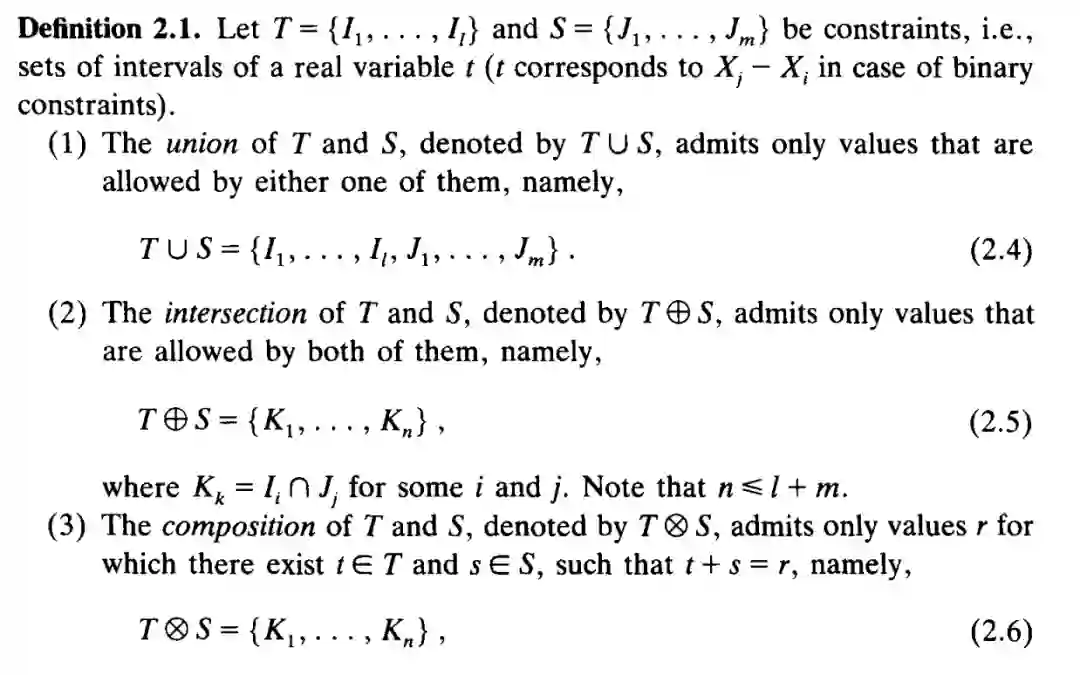。在这个叫做时间约束满足问题(TCSP)的框架中,代表时间点和时间信息的变量由一组一元和二元约束进行表示,每一个指定一组时间间隔。该框架的独特特征在于允许处理度量信息,即评估不同事件之间的时间差。