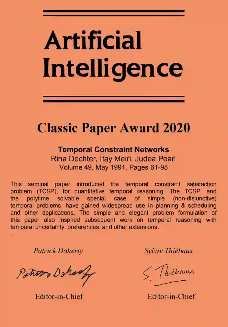 近日,图灵奖得主、贝叶斯网络之父 Judea Pearl 在推特上提到,自己在三十年前与当时的博士生 Rina Dechter、Itay Meiri 合著的论文《时间约束网络(Temporal Constraint Networks)》,获得了由人工智能顶级国际期刊 AIJ 颁发的 2020 年经典论文奖。
