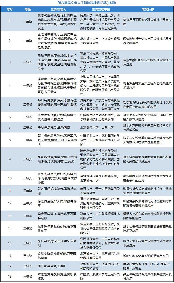 湖南大学黎灿兵、中国科学院自动化研究所王金桥、北京邮电大学辛阳、中国矿业大学郭一楠、国电联合动力技术有限公司褚景春、金蝶软件(中国)有限公司张良杰等完成的项目成果分别获得吴文俊人工智能科技进步奖二等奖。