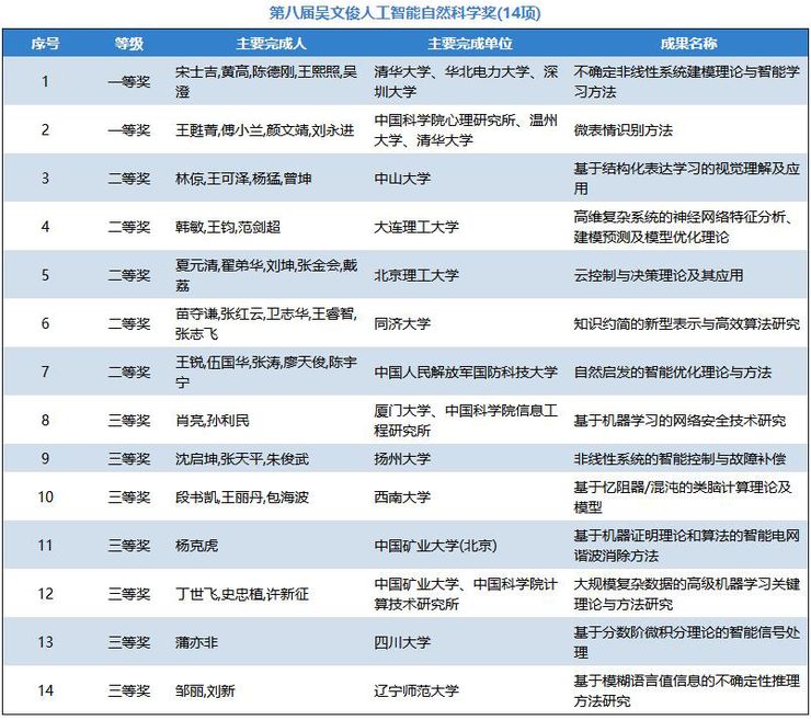 中山大学林倞、大连理工大学韩敏、北京理工大学夏元清、同济大学苗夺谦、中国人民解放军国防科技大学王锐等完成的项目成果分别获得吴文俊人工智能自然科学奖二等奖。
