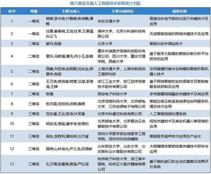 北京明略软件系统有限公司技术创新工程、深圳云天励飞技术有限公司技术创新工程、北京奇虎科技有限公司技术创新工程、平安科技(深圳)有限公司技术创新工程、苏州思必驰信息科技有限公司技术创新工程、苏州清睿教育科技股份有限公司技术创新工程、虹软(杭州)多媒体信息技术有限公司技术创新工程、达而观信息科技(上海)有限公司技术创新工程、南京汇川图像视觉技术有限公司技术创新工程、广州佰聆数据股份有限公司技术创新工程、北京地平线机器人技术研发有限公司技术创新工程等分别获得吴文俊人工智能科技进步奖(企业技术创新工程项目)。