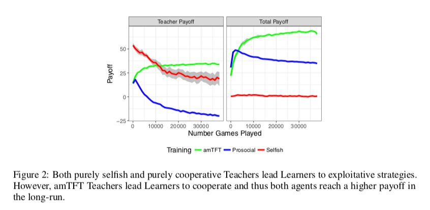 这里采用的固定的 agent 的策略为:合作,竞争,amTFT。面对合作/竞争的 agent 时,selfish 学到利用。面对 amTFT,selfish 最终学到合作。
