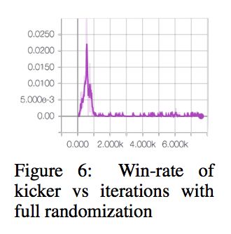 4. kick and defend:射门。一个 agent 射门,一个 agent 防守。射门的地方有 6 个 unit 宽,成功的射门或者防守获得 +1000,失败的获得 -1000。防守的 agent 不能离开球太远,太远的话,给予 -1000 的惩罚,另外如果防守成功,而且碰到球,再给予 +500 的奖励,如果最后还站着,再给 +500。