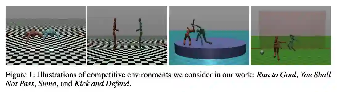 在 run-to-goal 和 you-shall-not-pass 中使用 MLP policy 与 value function,在 sumo 和 kick-and-defend 中使用 LSTM policy 与 value function(下面会提到)。