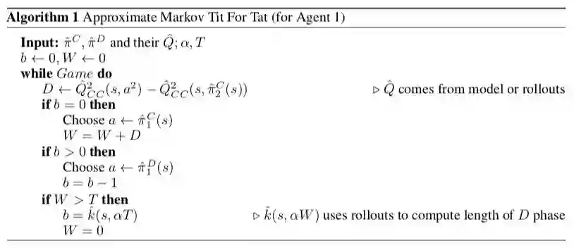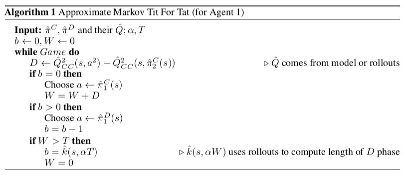 在这里 amTFT 的实际做法并不是像 TFT 那样,不停地按照对手的 action 来调整自己的 action,而是变化为 defect 之后,保持 defect k step,然后调整为 cooperation,再次观察对手的合作程度。