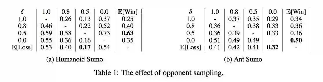 不同 opponent sampling 的影响,ant 一直都是均匀的好,因为 ant 简单,random 的防守其实也不错,但是 human 形状的从一半开始采样好,因为 human 更难,随机不好。