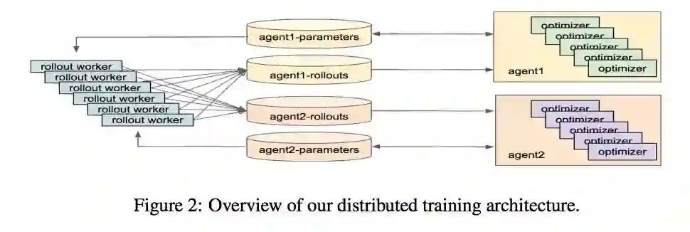 但是用 independent 训练时,又容易有方差的问题。为了缓解方差的问题,这里的采用非常大的 batch size 的 distributed PPO 来做 independent 的 training。
