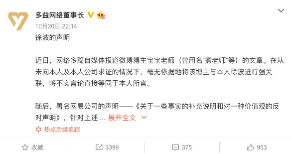 而事情在昨晚又有新的进展,一个微博认证“多益网络董事长”的账号发微博称,自己(也就是徐波)并不是微博账号@煮老师 的注册人。